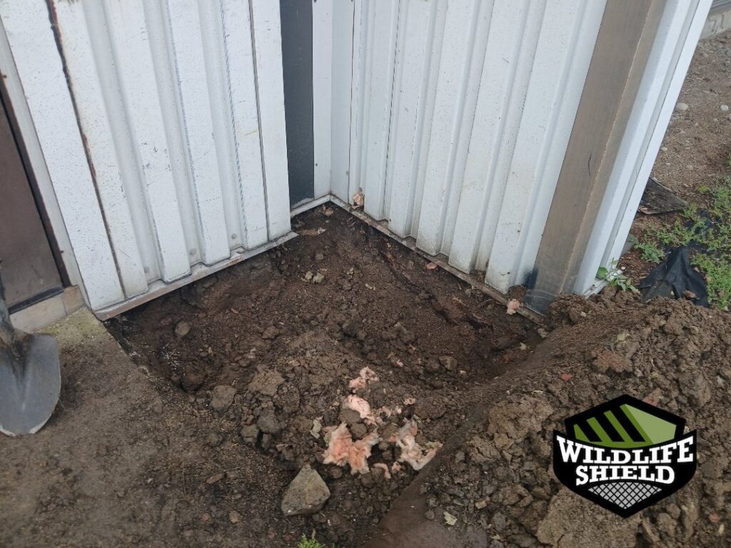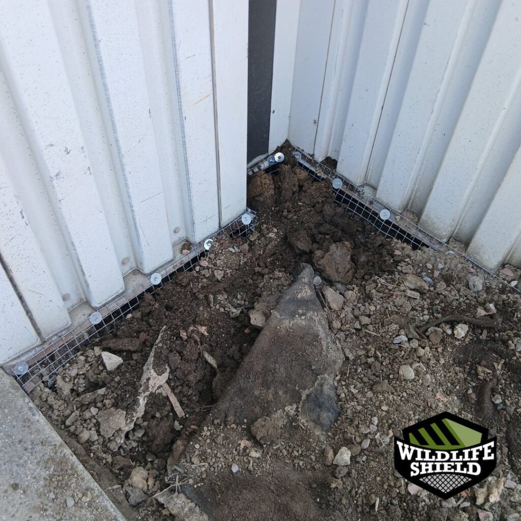 Once trenching was possible, a perimeter trench was excavated around the accessible sections of the extension. Galvanized steel mesh was securely fastened to the structure and buried approximately one foot down and extended outward to deter future digging. After confirmation of no further activity, the one-way door was removed and the entry point fully sealed.